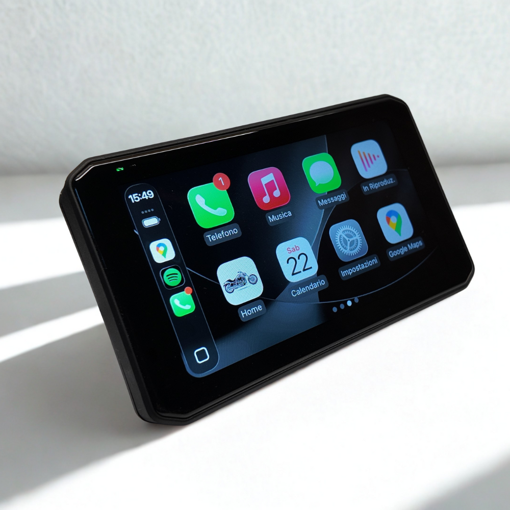 Apri l’app, selezioni RideBuddy e il display si sincronizza automaticamente con mappe, musica e notifiche.